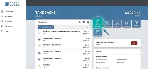 We've created an integrated flow that gives the consumer and your team the flexibility to manage Take-Backs. Your teams have the same access as borrowers. And with your core still the system of record, your processes and reporting don't change.